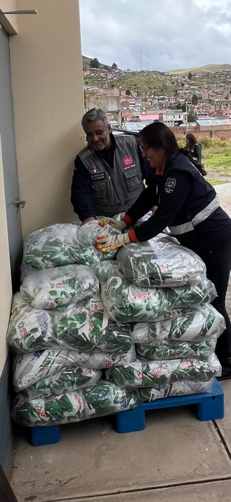 A Puno hemos enviado 500 canastas, y a Huancavelica 9 toneladas de útiles de limpieza y aseo personal, complementando los bienes de ayuda humanitaria del INDECI y de ACNUR. Estas donaciones serán distribuidas en las próximas semanas en los diferentes distritos de estas localidades.